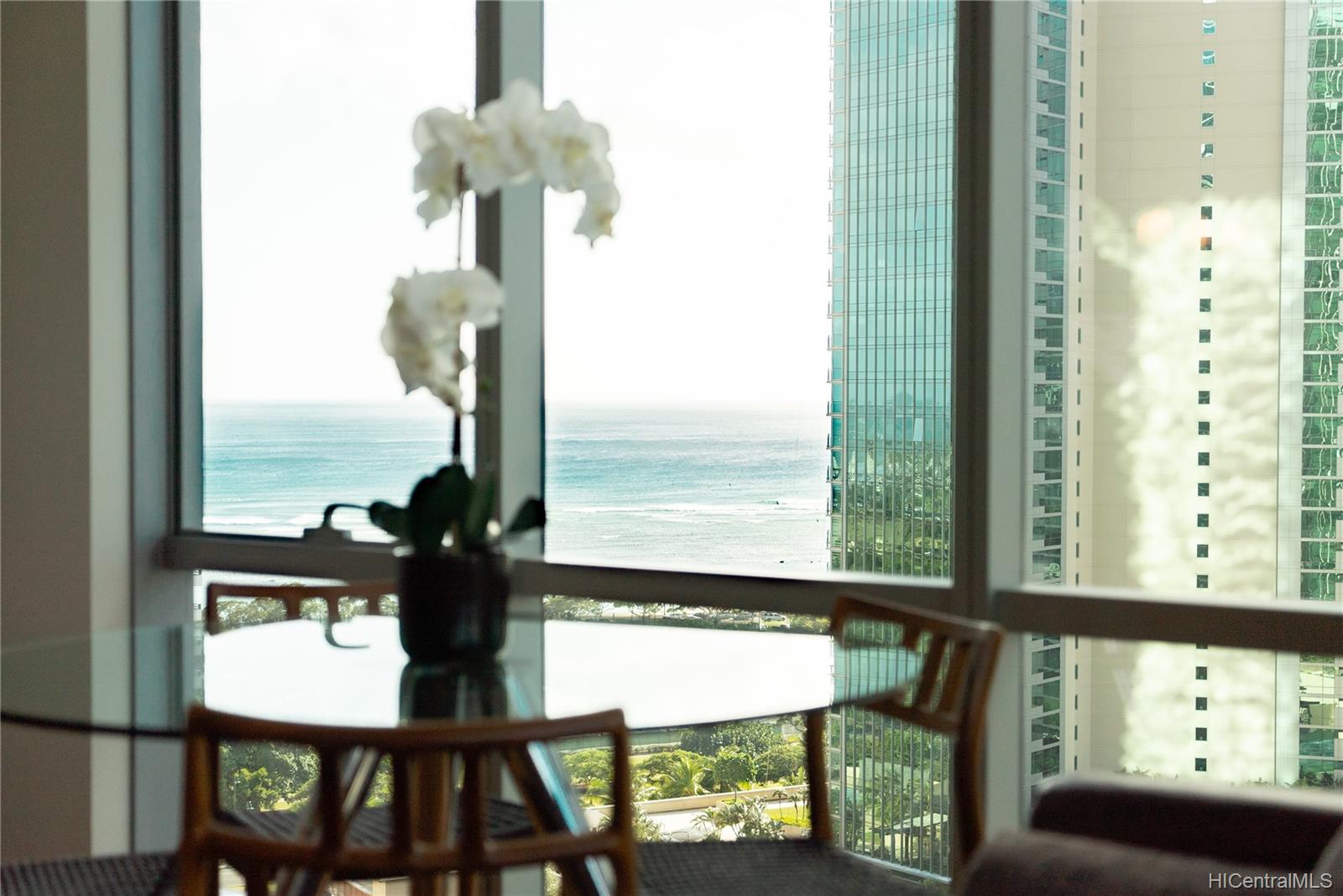 1,069 sf corner unit 2 bed, 2 bath, 2 parking with perfect location in walking distance to Ala Moana Shopping Center, Beach Park and Ward Village. This unit was bought and rarely used by the original owner and is in like new condition. Enjoy beautiful mauka, city and peekaboo ocean views from floor to read more ceiling glass windows with motorized blinds and luxury finishes throughout. Unit is furnished with Inspiration furniture and is negotiable with sale. Waihonua comes with a full package of luxury amenities including beautifully designed pool deck, jacuzzi, BBQ areas, movie theater, fitness center, yoga room, private dining and lounge areas for residents exclusive use. Bike storage, surfboard storage and EV chargers available.