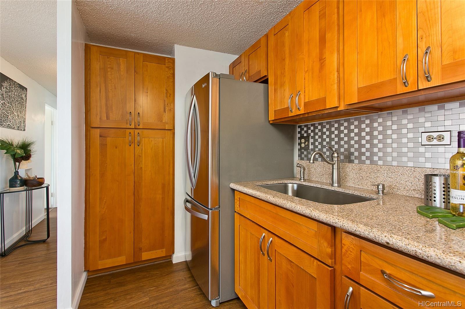 Beautiful condo on the slopes of Punchbowl, away from the hustle & bustle of the city, yet offers convenient locale near restaurants, schools, banks, library, farmer's market, & downtown! Light & bright w/floor to ceiling windows; cool trade wind breezes w/city & mountain views. Modern LED light fixtures, Stain Master waterproof vinyl flooring, Master read more bedroom w/walk in closet, 2nd bedroom has triple shoji doors in an elegant bamboo design offering a flexible floor plan for added living area or home office w/a view & tons of natural light! Upgraded kitchen: Granite counters, Cherry finished cabinets & pantry, large island w/generous storage, deep sink, French door refrigerator w/ice maker, built in microwave, new bathroom vanity, stack washer/dryer, gated parking, bbq area. Move in Ready!